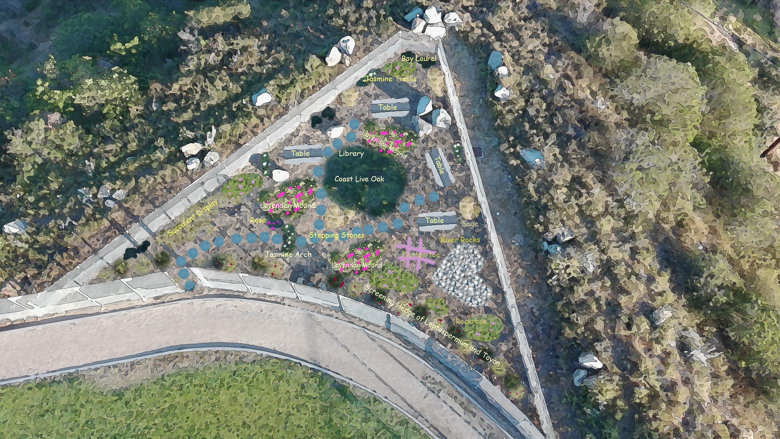 A collaborative garden at Double Peak School honoring Rosie's loving spirit — featuring native plants, student artwork, and peaceful seating areas. Coming June 2026.